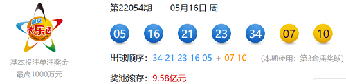 5月16日,超级大乐透迎来“10亿元大派奖”的第15期开奖——第22054期前区开出号码“05、16、21、23、34”,后区开出号码“07、10”。本期全国销量为3.19亿元,为国家筹集彩票公益金1.15亿元。