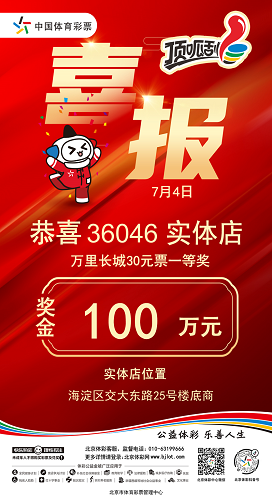 7月4日下午,在位于海淀区交大东路25号底商的36046体彩实体店,购彩者小刘(化姓)刮出即开票“万里长城”的一等奖,奖金100万元。