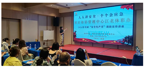本次培训集中学习了市体育局2024年“安全生产月”活动相关文件精神,围绕“人人讲安全、个个会应急——畅通生命通道”主题观看了“安全生产月”主题宣传片,对单位消防等设施设备进行了安全隐患排查,并对可能出现的突发事件开展了应急管理培训和演练。培训中,重庆市安宣消防宣传中心讲师为参加人员讲解了火灾危害、预防及火场疏散逃生、消防器材的正确使用、防止电梯安全事故等消防知识,并在物业公司的配合下启动火灾应急程序,进行消防疏散演练。