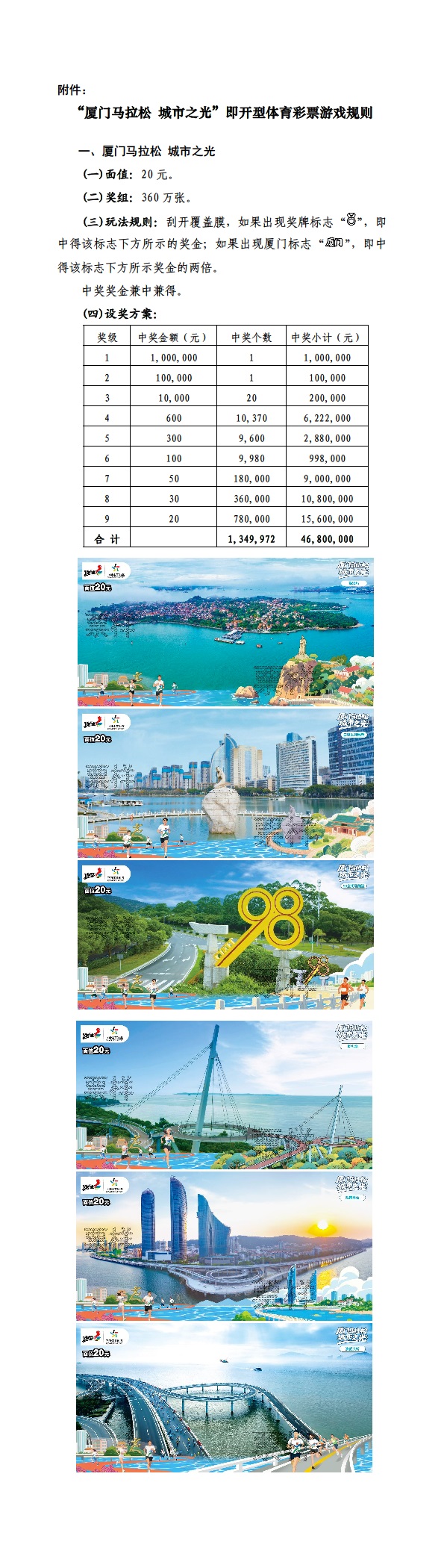 根据《财政部关于“为中国力量加油 雪舞龙腾”等14款即开型体育彩票游戏的审批意见》(财综〔2025〕36号)的要求,我中心将于2025年12月上市“厦门马拉松 城市之光”即开型体育彩票游戏,具体如下:20元“厦门马拉松 城市之光”。