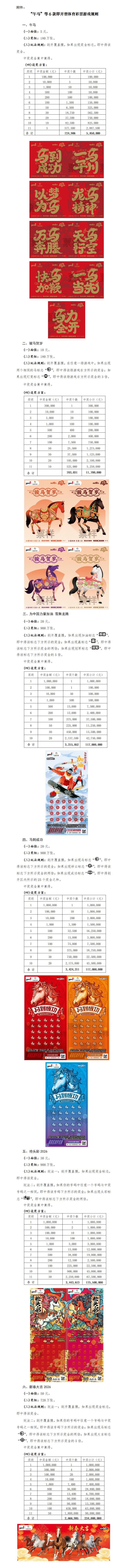 根据《财政部关于“为中国力量加油 雪舞龙腾”等14款即开型体育彩票游戏的审批意见》(财综〔2025〕36号)的要求,我中心将于2026年1月上市“午马”等6款即开型体育彩票游戏,具体如下:5元“午马”、10元“骏马贺岁”、20元“为中国力量加油 雪舞龙腾”、20元“马到成功”、30元“抢头彩2026”、50元“新春大吉2026”。