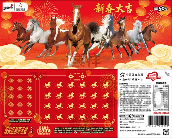 “新春大吉2026”面值50元,共有1个票面场景,票面采用了横版设计,整体色调采用喜庆的中国红,以八匹奔腾而来的骏马为主元素,金色祥云纹饰、火红灯笼点缀其间,烘托出热闹、喜庆的节日气氛及马年大吉的美好祝福。设计大气,票面还使用了特殊光油,让“新春大吉”的美好祝愿更加立体。刮开区设在票背,增强了这款票的收藏价值,是新春佳节传递喜悦、分享好运的时尚好物。