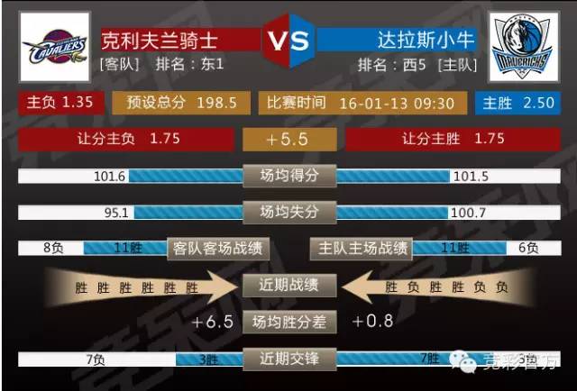 本场比赛竞彩让分玩法开出小牛主场受让5.5分。截至目前,小牛阵容保持齐整,球队在西部也打出了不错的竞争力,不过明天与骑士的比赛过后,后天他们还将背靠背赴客场挑战雷霆(W3),连续遭遇联盟劲旅,小牛的心理和体能都将受到考验;骑士本赛季志在夺冠,而球队的阵容已经回归齐整,接下来他们需要等待欧文彻底找回状态。