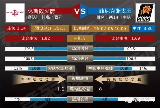 竞彩让分胜负方面开出客让8.5分,休斯顿火箭客场挑战太阳队,中锋霍华德停赛归来,加上约什史密斯回归带来的化学作用,可坏消息是火箭正与凯尔特人商议霍华德交易事宜,综合来看,火箭队客场赢下刚刚换帅的太阳队并非难事,但过关或许有些困难,笔者推荐本场让分主胜。