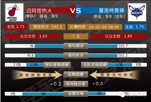 由于怀特塞德此前伤停,热火老将斯塔德迈尔得到了首发出战的机会,近五场比赛他场均为球队贡献7.8分8.4个篮板1.4个盖帽,虽然发挥不及当年,但仍对球队有所帮助,而目前在怀特塞德并未完全找回状态的情况下,斯塔德迈尔将成为球队的补强手段;黄蜂大将肯巴-沃克和杰佛森二人目前处于伤停状态中,球队阵容深度并未恢复,不过上战爆冷拿下骑士后,全队的士气有不小的提振。综上,本场在竞彩胜负固奖开出主胜1.75、主负1.75的情况下,笔者博黄蜂主胜。